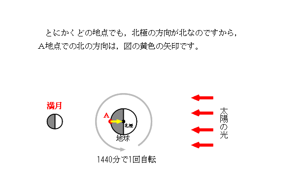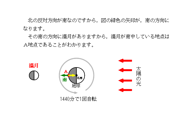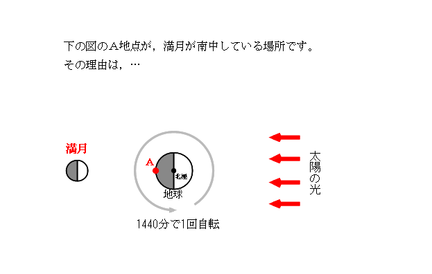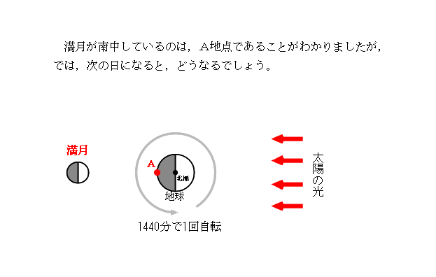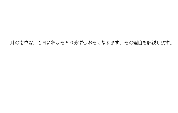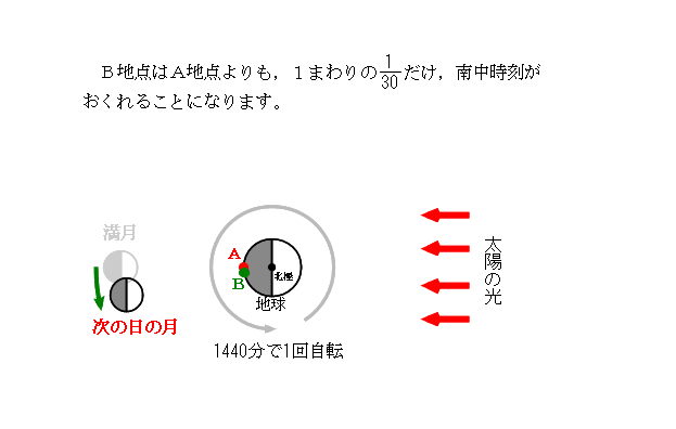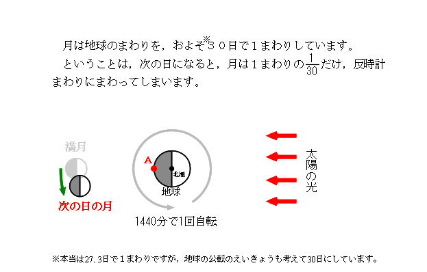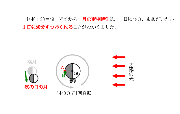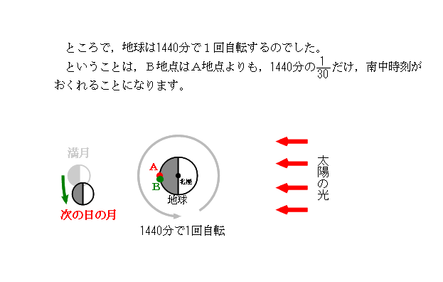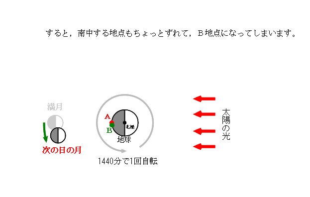 月の動き −4年生学習用− の,「月の南中が遅くなる理由」についての解説です。
